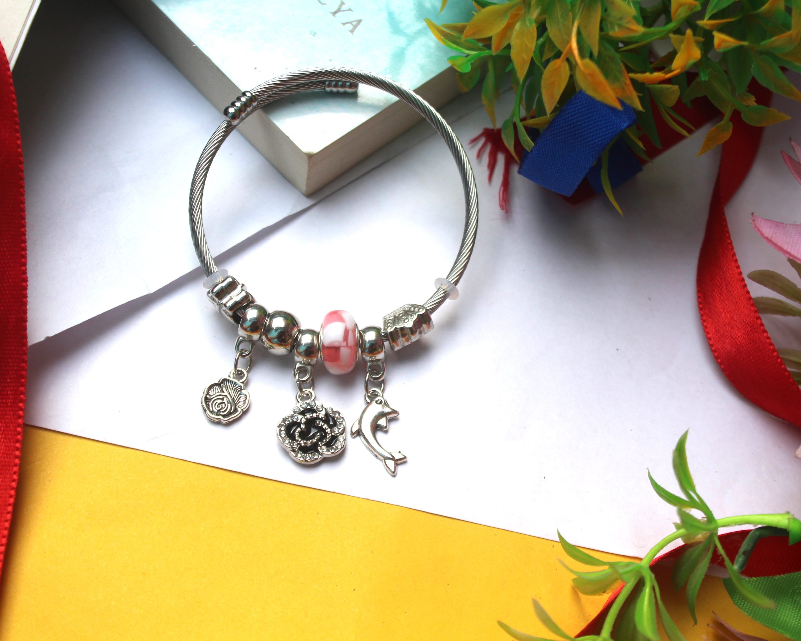 Silver-Tone Twisted Wire Charm Bracelet with Pink Glass Bead, Floral Accents & Dolphin Dangle – Whimsical Ocean Garden Collection